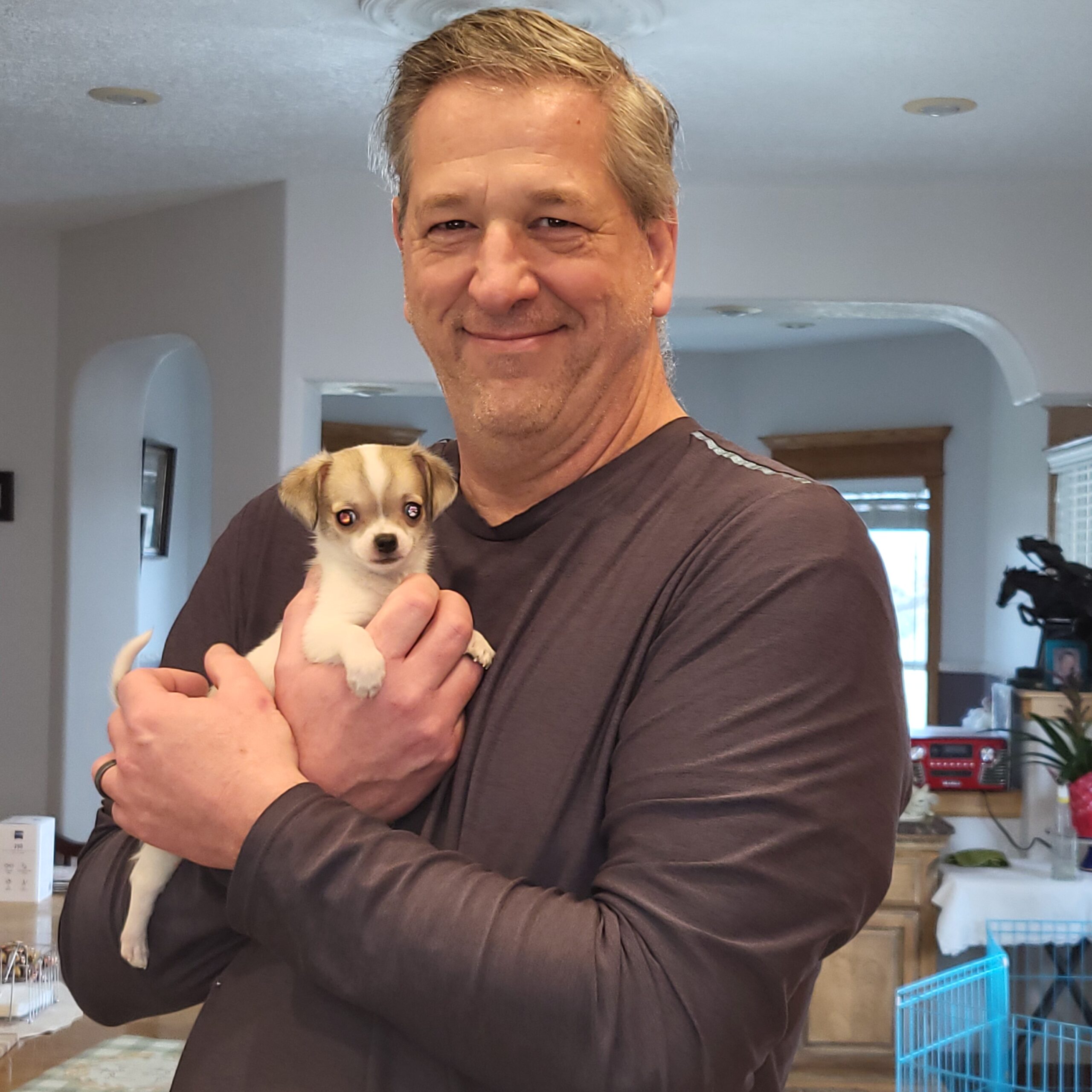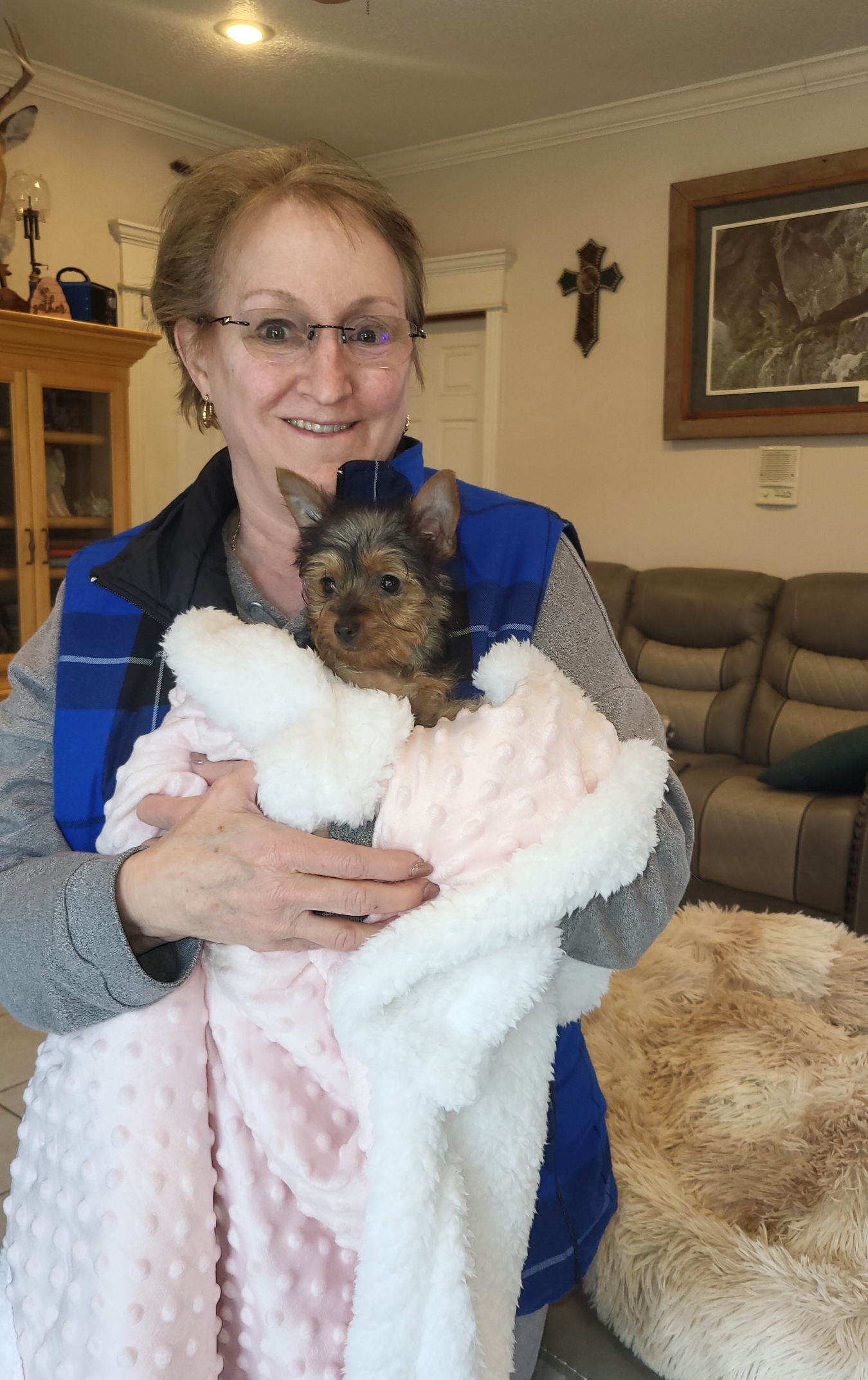 This dog has the biggest sense of humor and keeps up laughing. He puts both paws on my husbands face to give him a kiss at night. Oh…and night time is a hoot. I have a small quilt that I have wrapped him in every night since we’ve had him. I then rock him or rub his head, he gives us kisses and goes night-night in his cage with a light blanket over it. When I put him in the quilt…he doesn’t even move. He just lays on his back and lets me bundle him. I’m glad it all worked out to where I got him. He is with the right family. Thank you for my Bailey!!